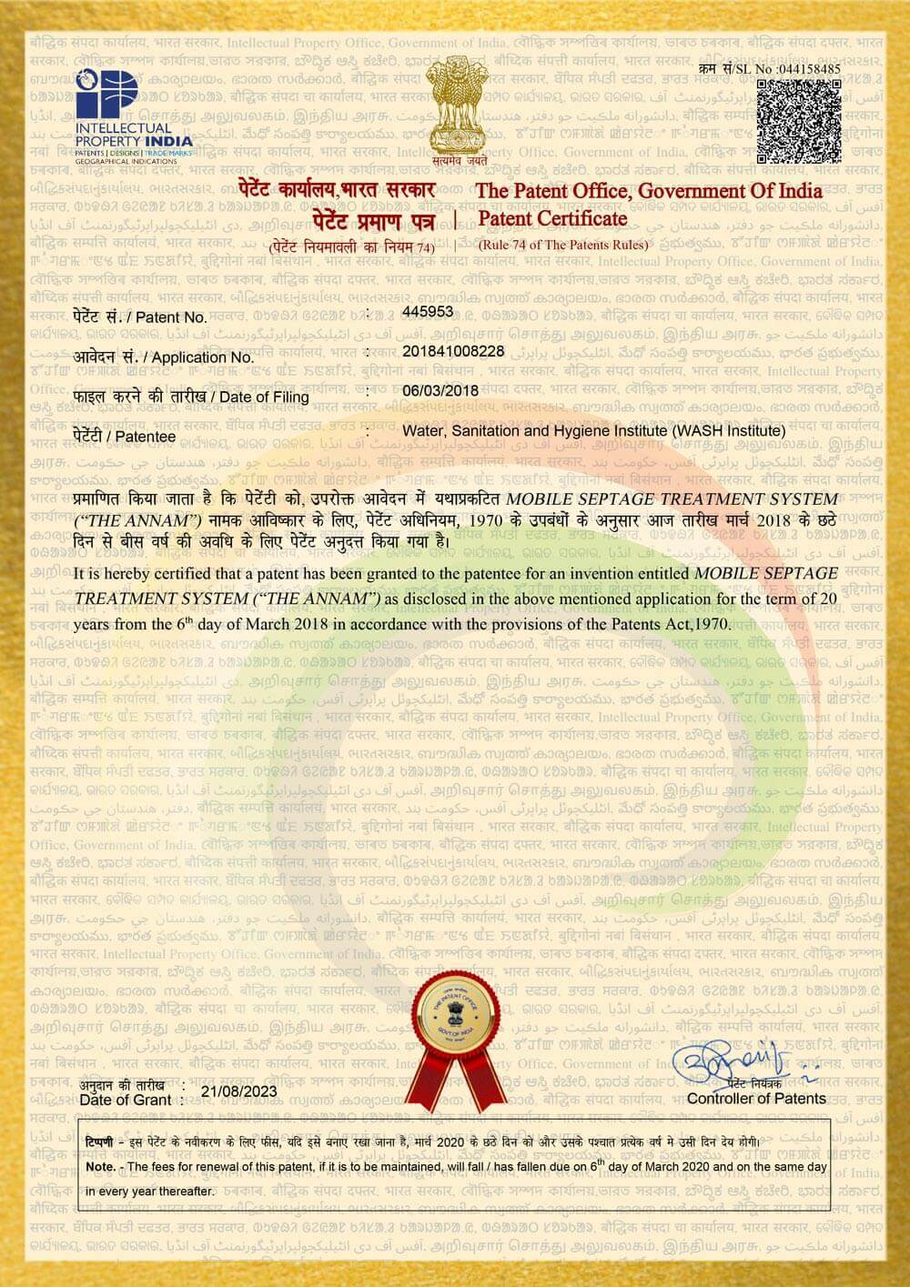 It is hereby certified that a patent has been granted to the patentee for an invention entitled MOBILE SEPTAGE TREATMENT SYSTEM (“THE ANNAM”) as disclosed in the application for the term of 20 years from the 6th day of March 2018 in accordance with the provisions of the Patents Act,1970.